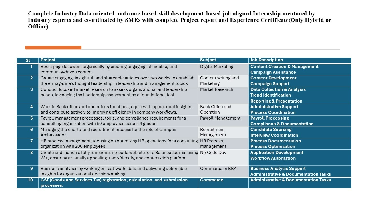 Complete Industry Data oriented, outcome-based skill development-based job aligned Internship mentored by Industry experts and coordinated by SMEs with complete Project report and Experience Certificate (Only Hybrid or Offline)