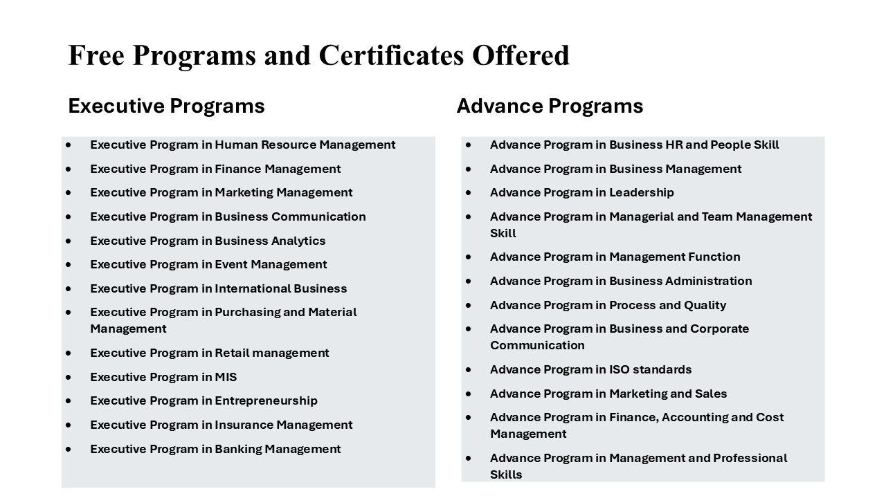 One Subject Based Internship Project | Two Advance and Executive Management Program | One Softskill Program | Industry Expert Sessions | Placement and Interview Assistance