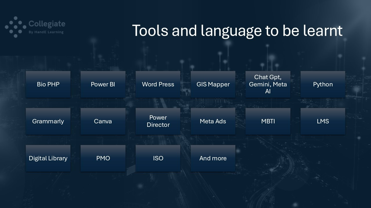Collegiate is an IPO (Internship providing org) offers complete Internship for Undergraduate students in Online and Offline mode through various digital and tech labs in actual work situations in on-site experiential learning for real industry and research project in various subject for advance learning with application