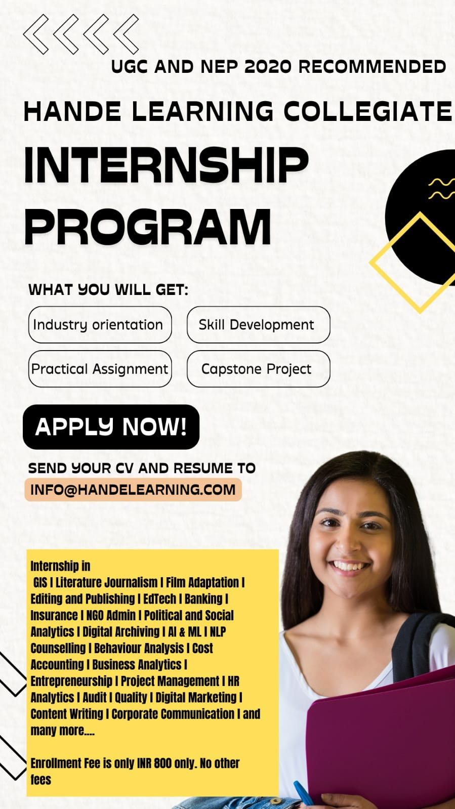 Collegiate Internship is the most Practical and Experiential Learning based programme includes complete subject learning, assignments and projects in different degree subjects, management and job function-based topics. This follows the complete guideline of NEP 2020 applicable to all the colleges and institutions across India.