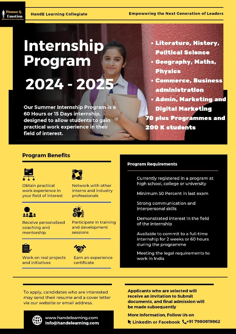 HandE Learning is the largest Management and Degree Subject based E-learning institute of India with 200,000 students offers most comprehensive and practical internship programmes across more than 20 subjects in 100 plus topics or concepts.